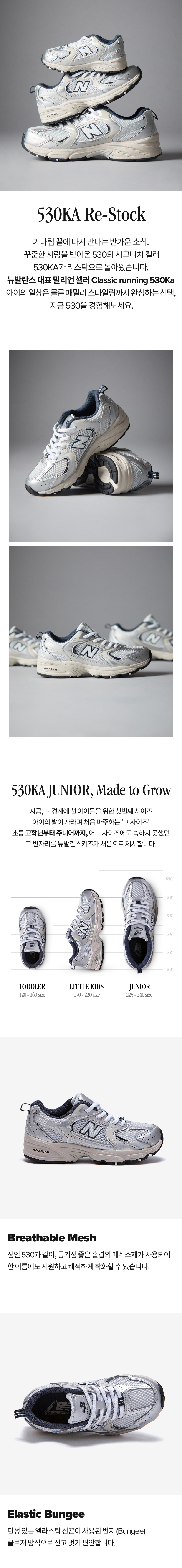 뉴발란스 클래식 러닝의 대표 모델인 MR530의 키즈버전입니다.
