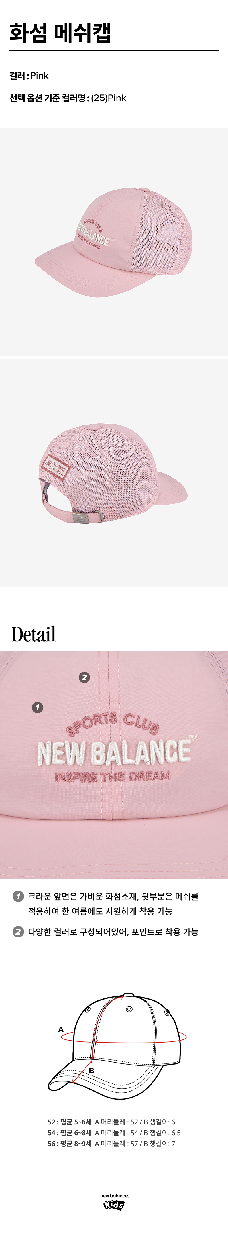사이즈(cm): [52](평균5세~6세) 둘레: 52 챙길이: 6 , [54](평균6세~8세) 둘레: 54 챙길이: 6.5 , [56](평균8세~9세) 둘레: 57 챙길이: 7