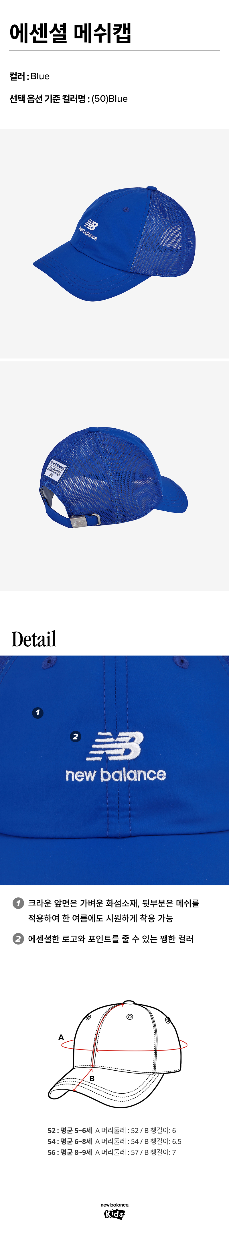 사이즈(cm): [52](평균5세~6세) 둘레: 52 챙길이: 6 , [54](평균6세~8세) 둘레: 54 챙길이: 6.5 , [56](평균8세~9세) 둘레: 57 챙길이: 7