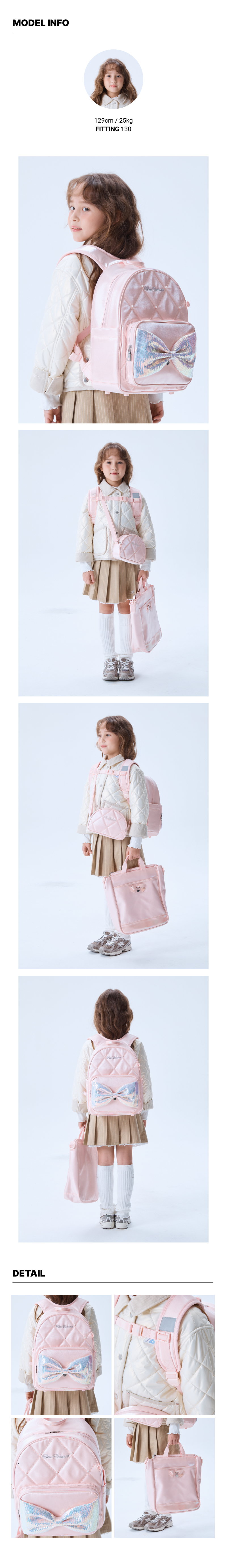 디자인 : 실키한 글로시원단의 퀼팅 패턴에 진주 장식으로 고급스럽고, 전면 포켓 입체 스팽글 리본으로 포인트를 주었습니다.