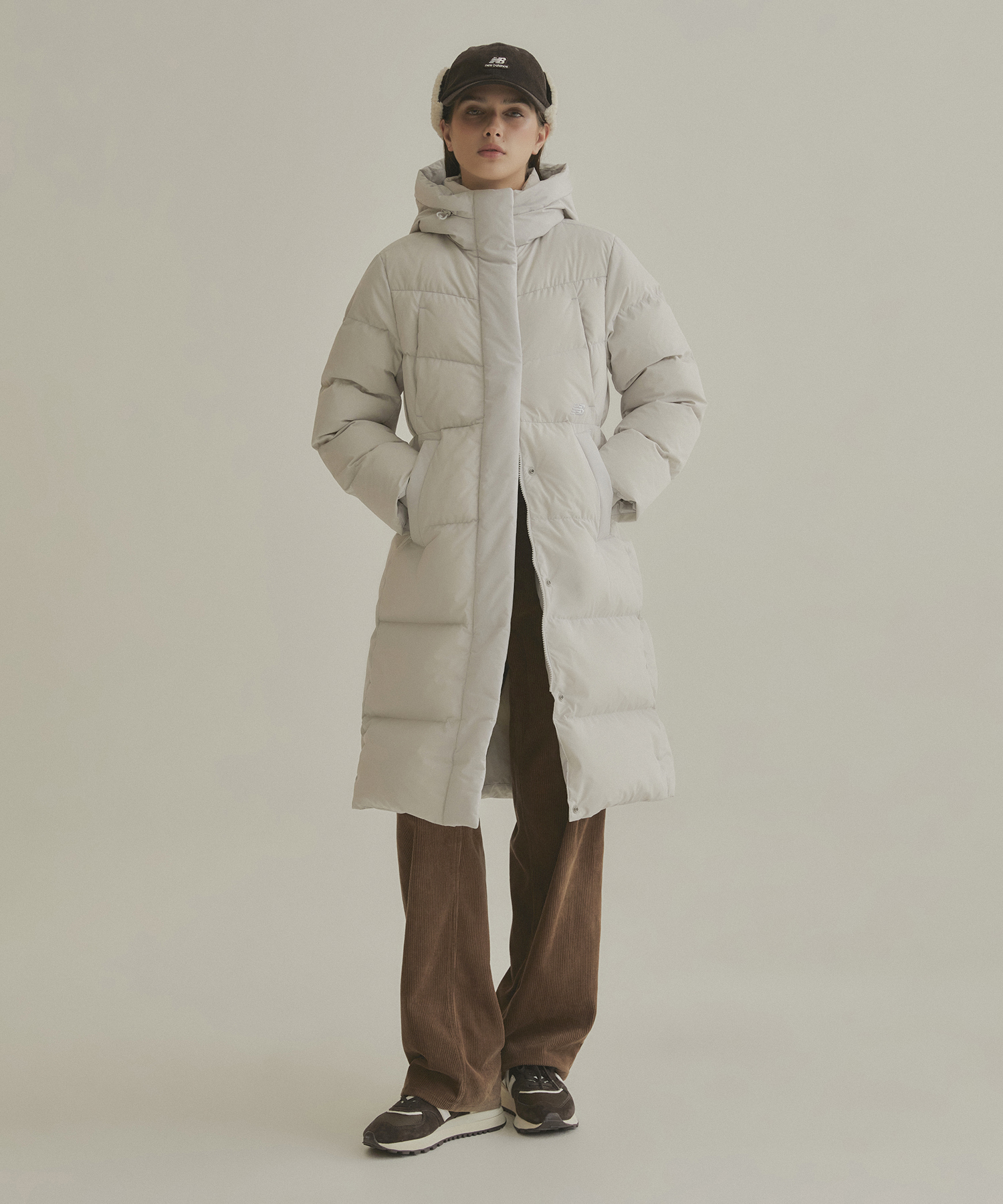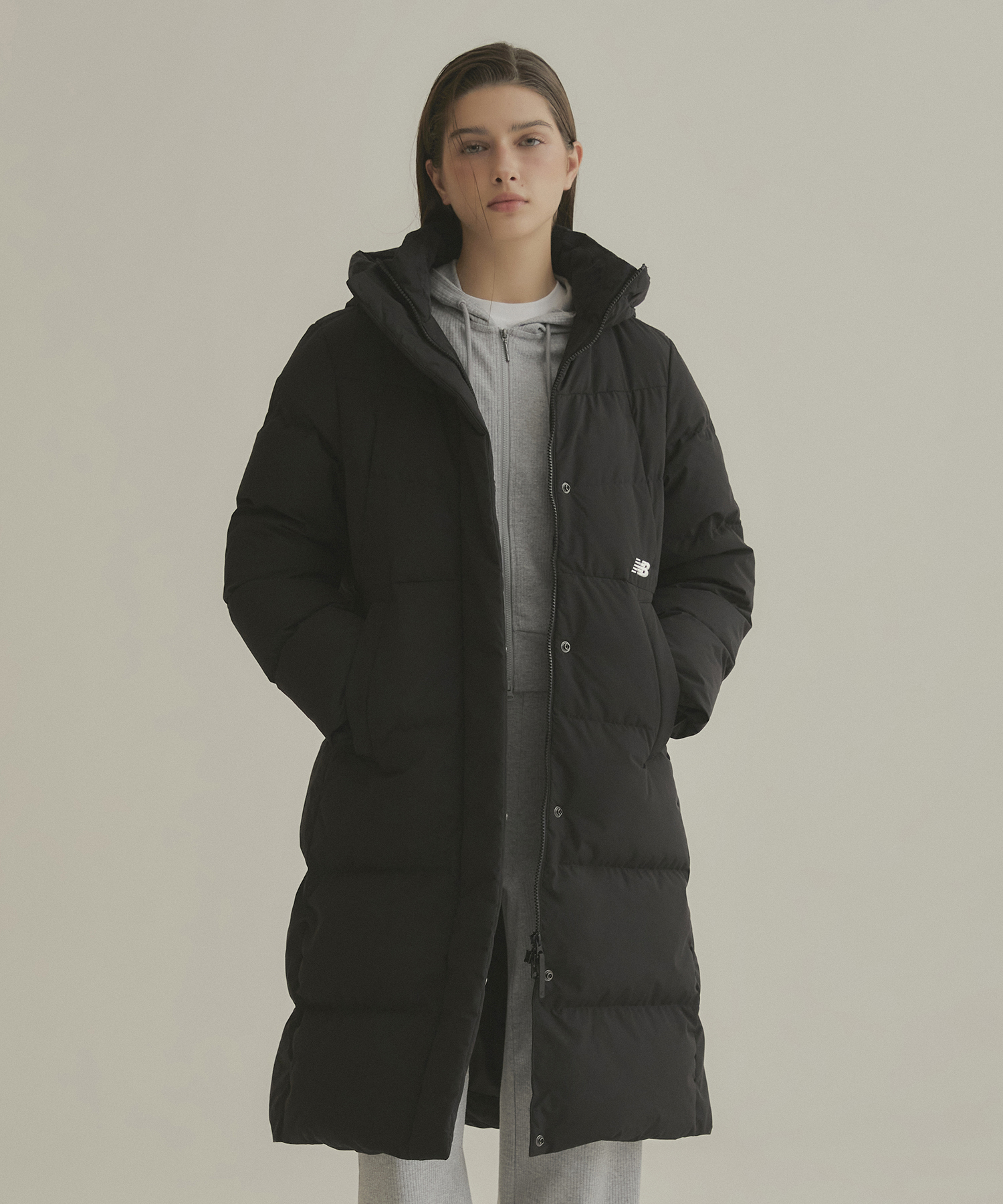 스포티한 디자인의 후드일체형 롱패딩으로 탁월한 보온성이며