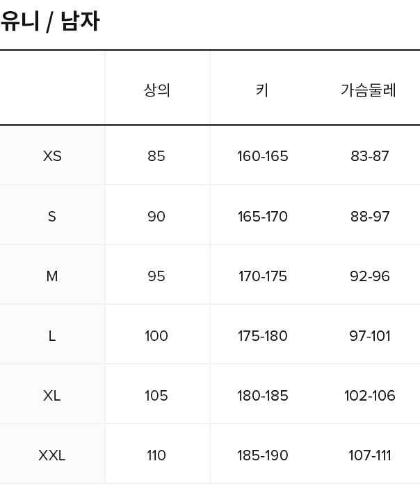 ※ 제품의 실측 사이즈가 아닌 각 사이즈에 맞는 신체 사이즈로 실 제품과 차이가 있을 수 있으므로 참고하시기 바랍니다.