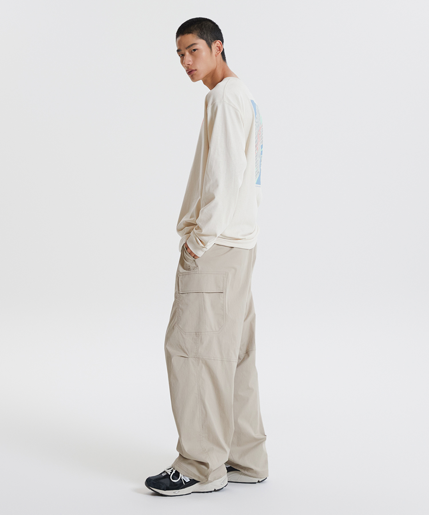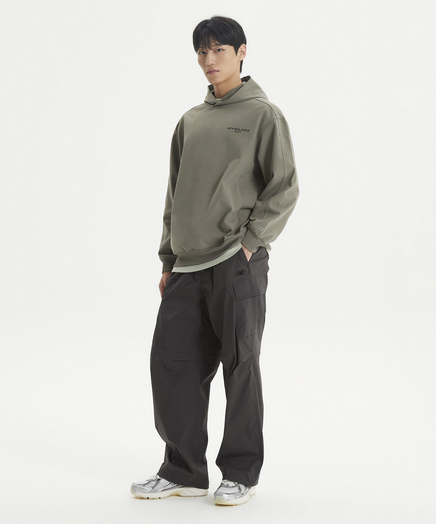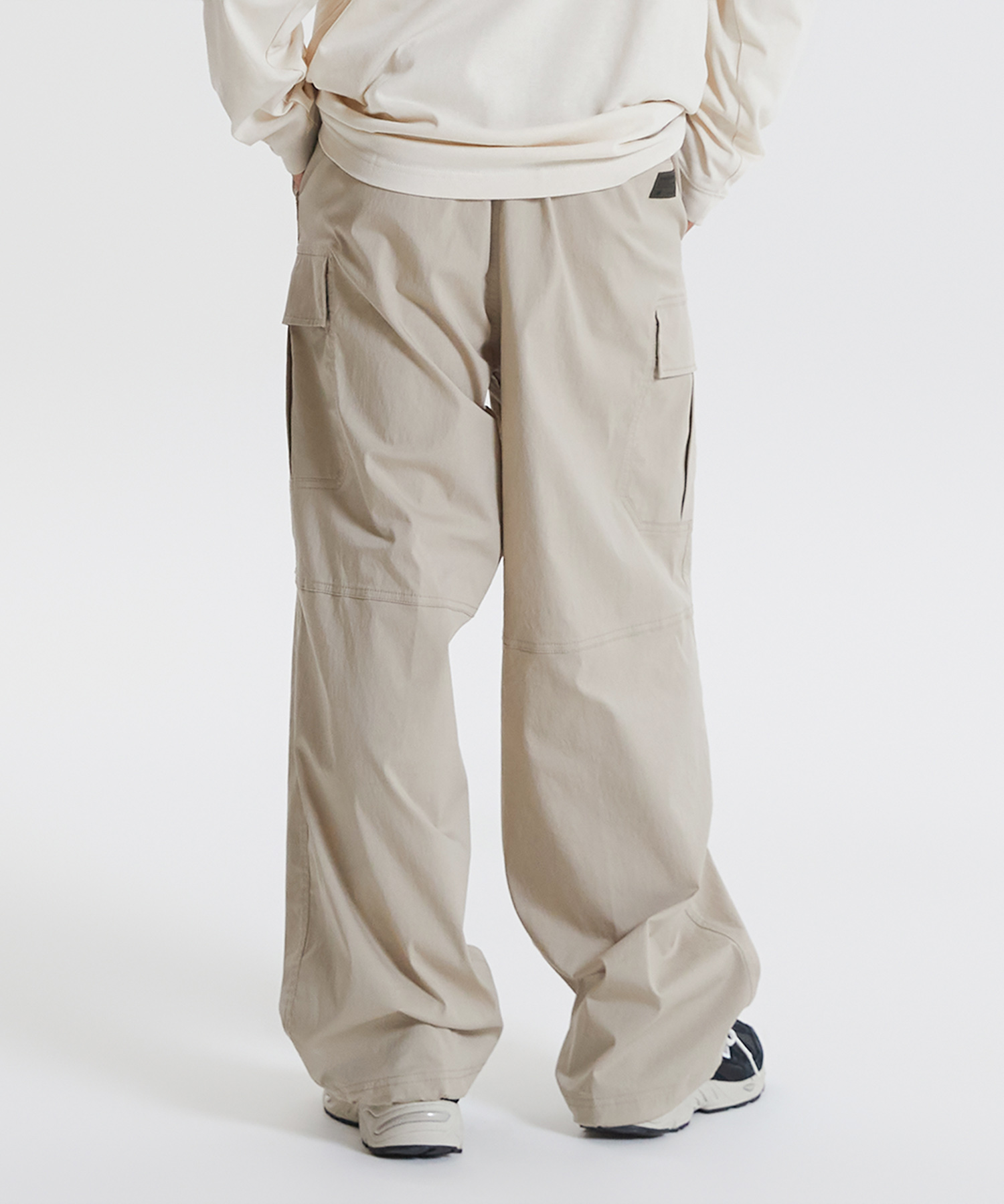 양쪽 사이드 카고 포켓 디테일과 백 포켓 상단 뉴발란스 레터링 포인트 라벨 사용하였습니다