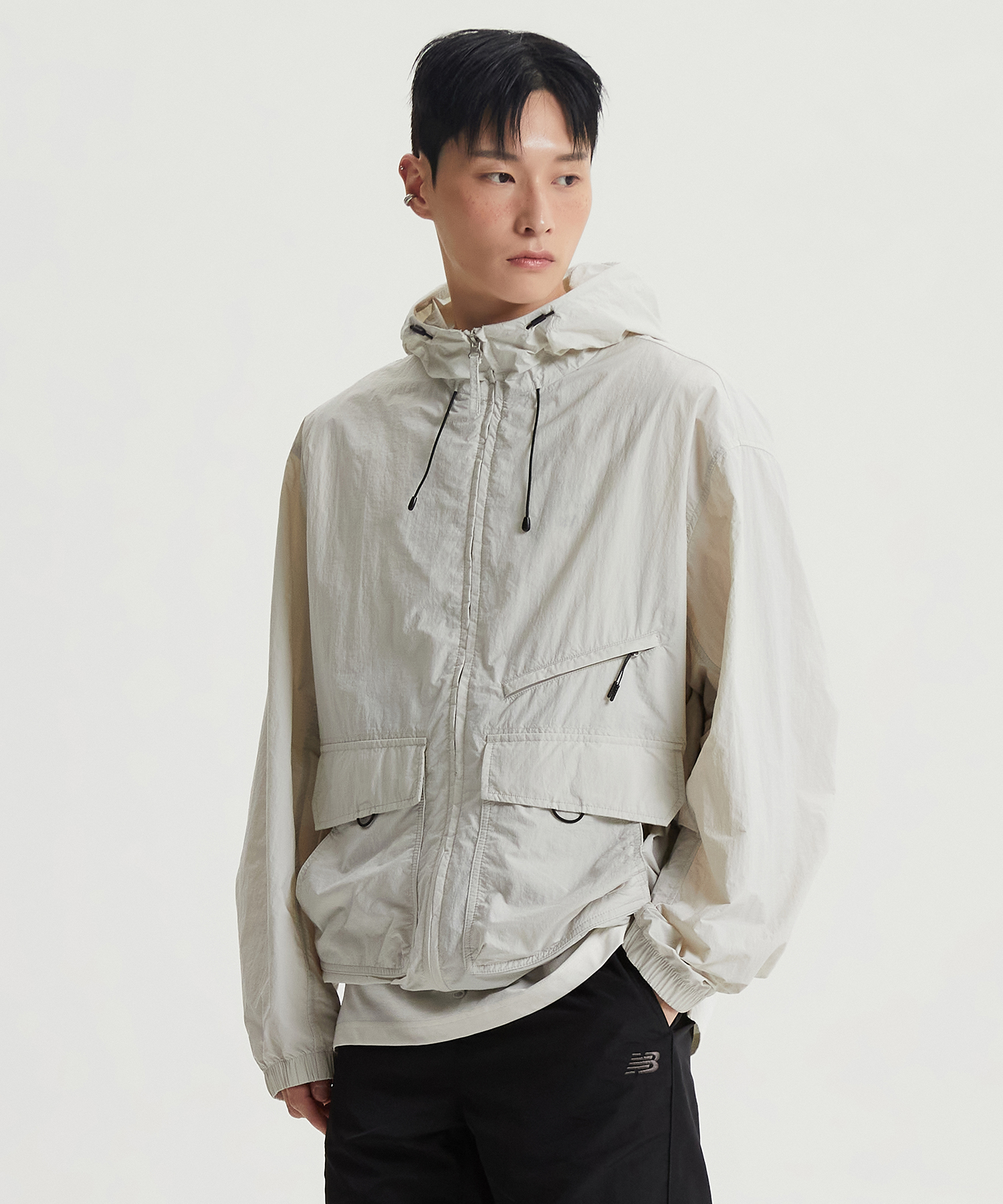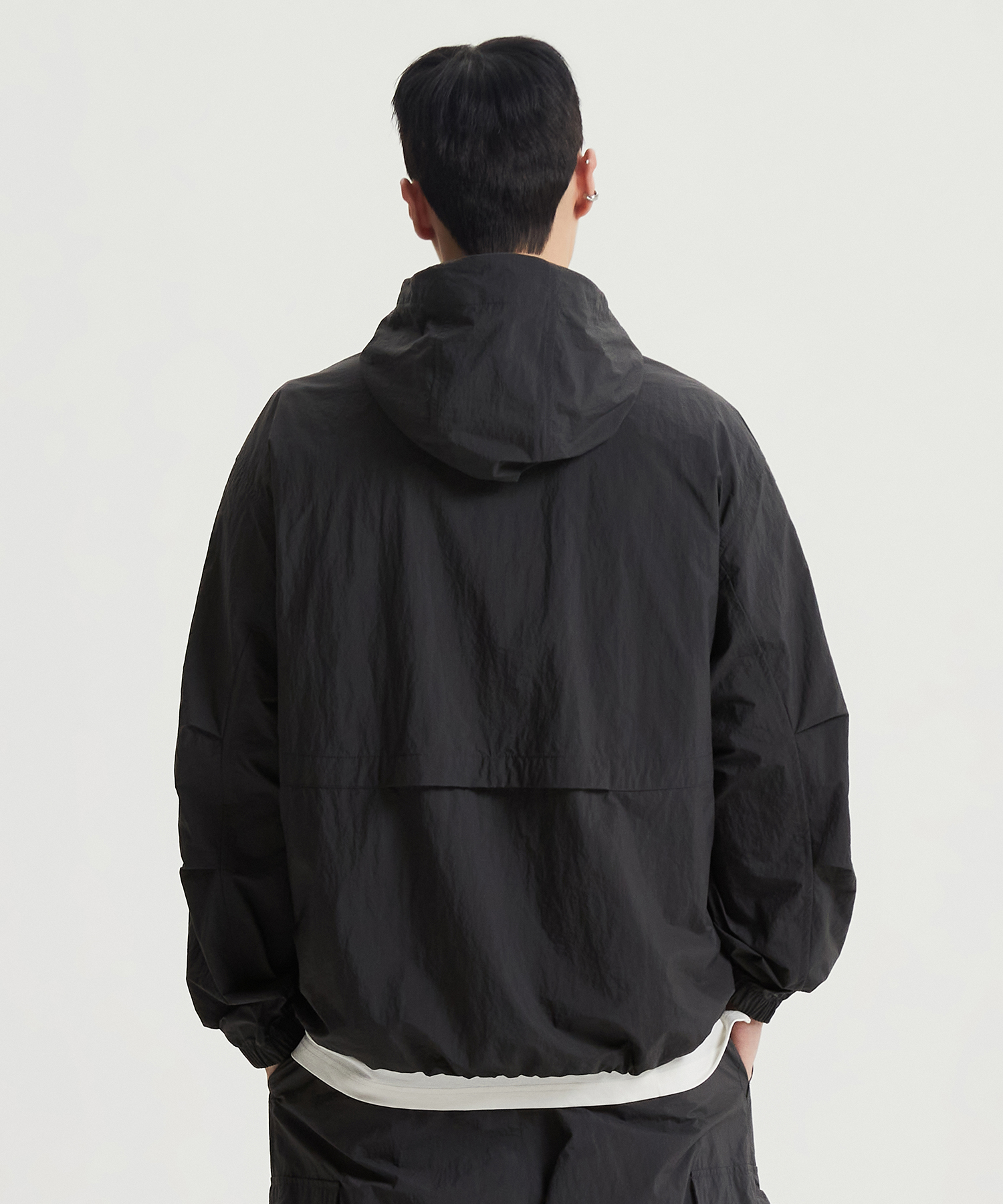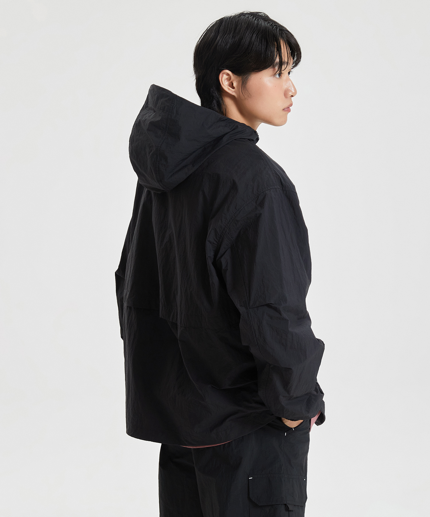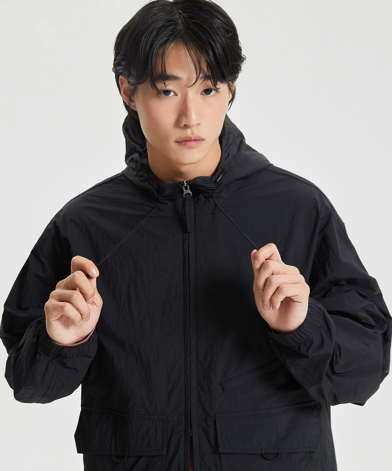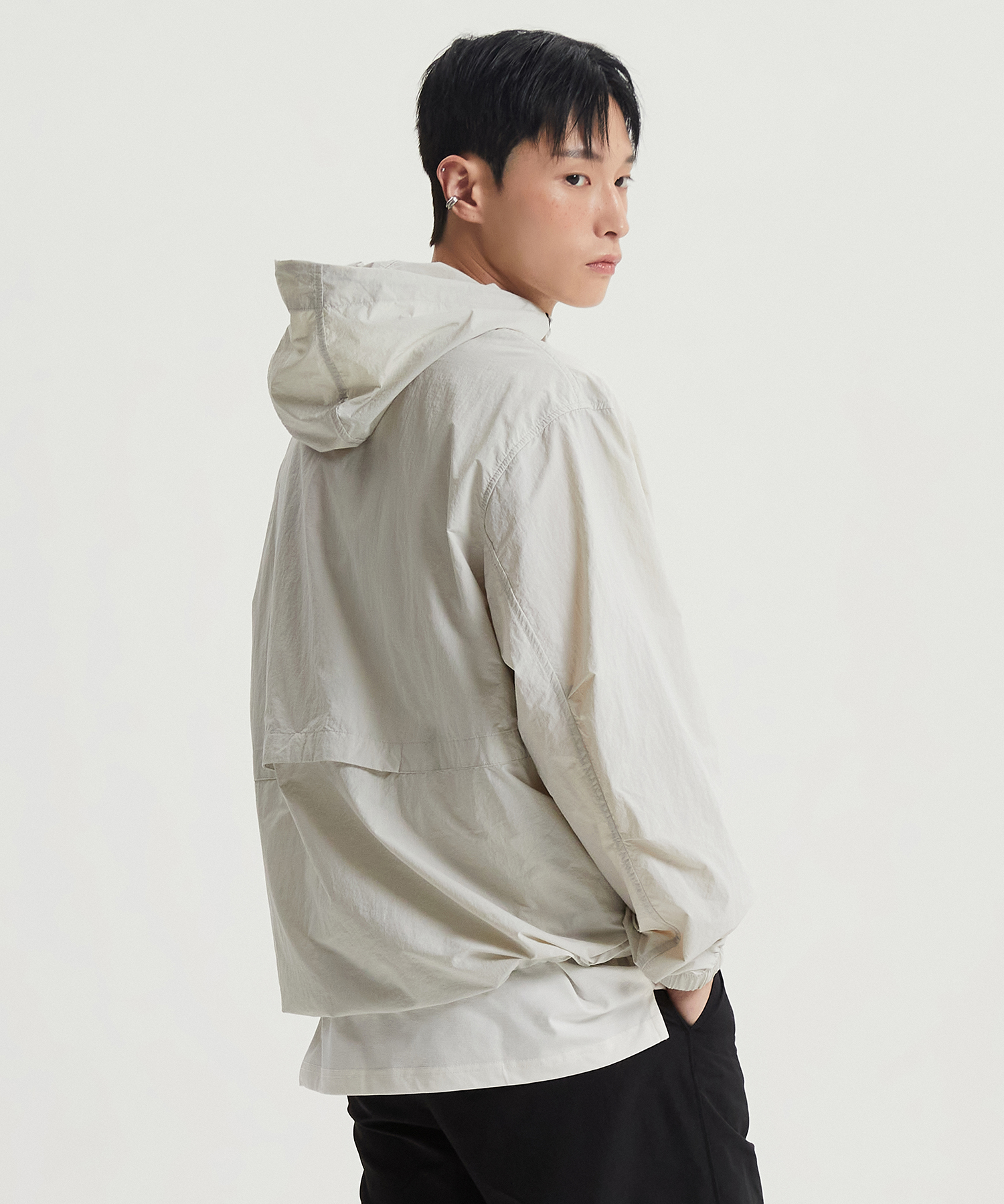 높게 설계한 넥 디테일에 후드 스트링을 더하여 가벼운 바람을 막아줍니다