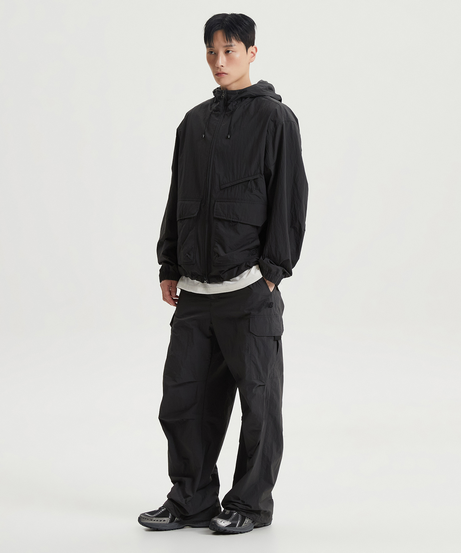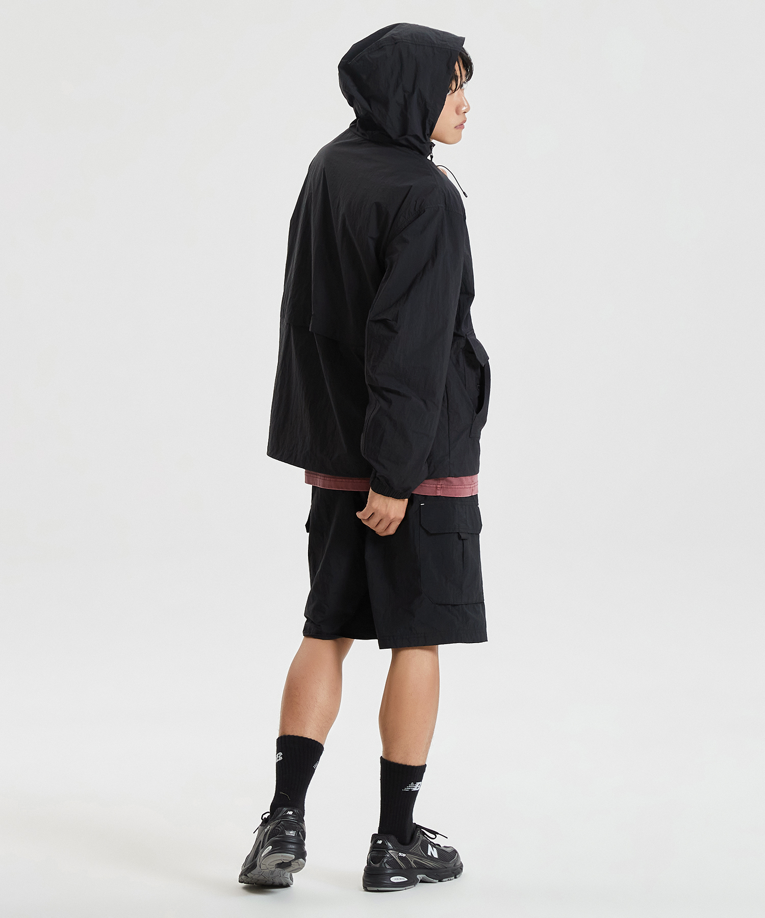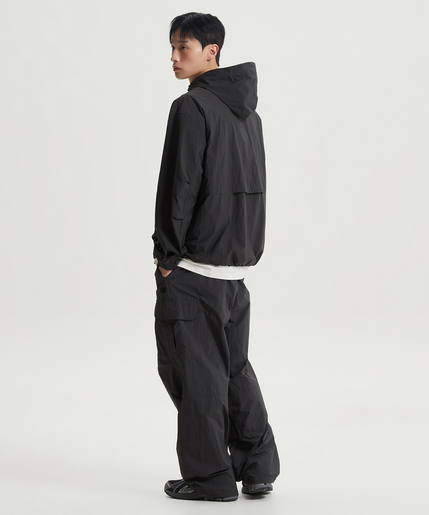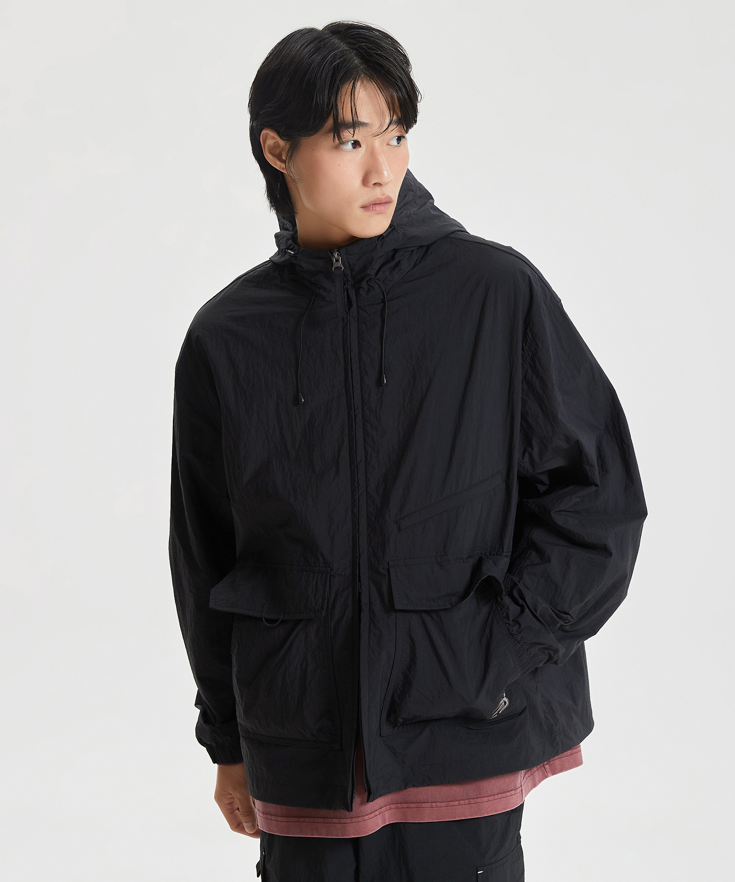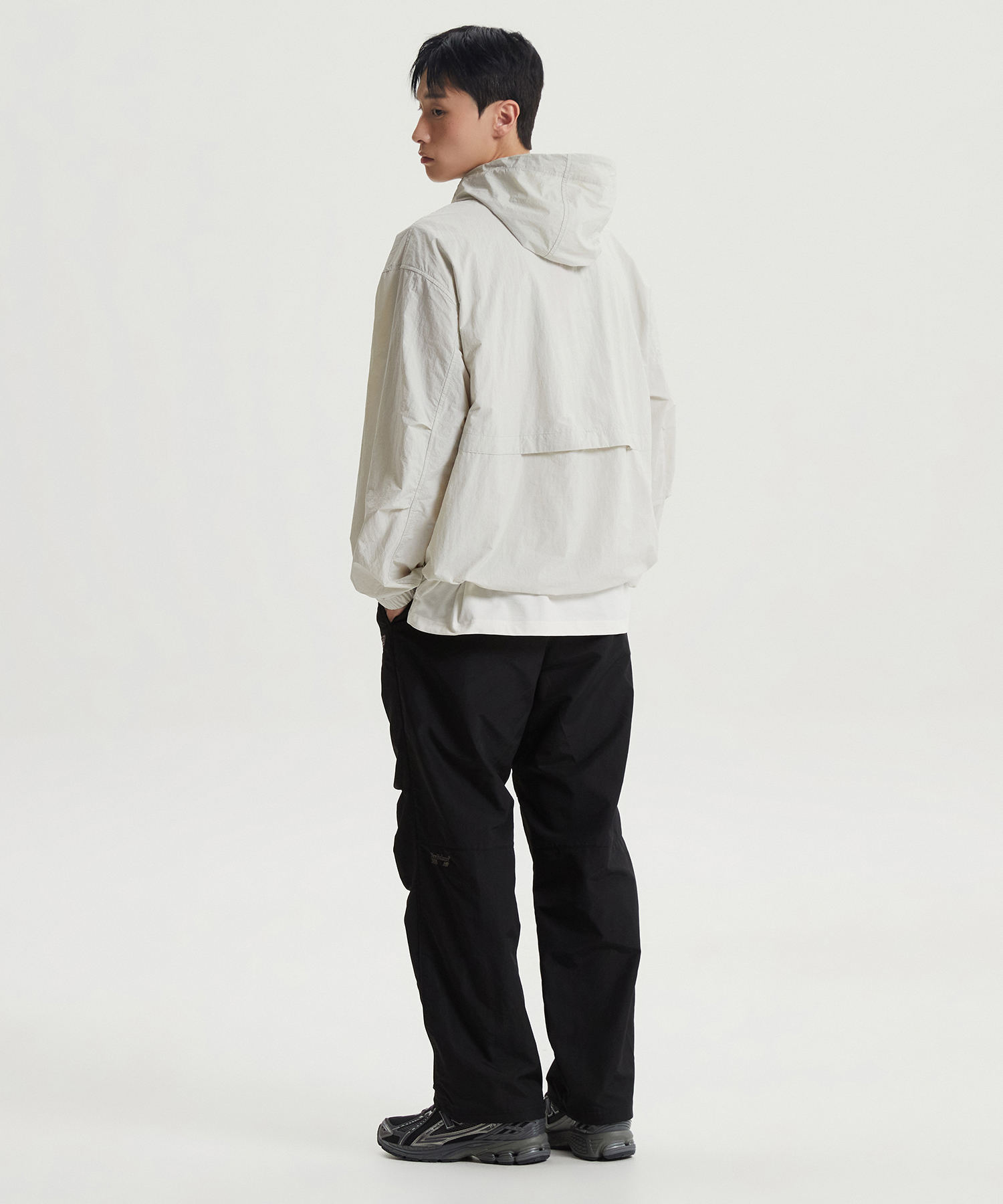 높게 설계한 넥 디테일에 후드 스트링을 더하여 가벼운 바람을 막아줍니다